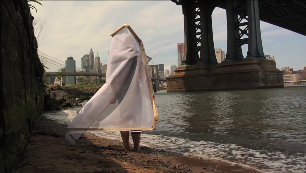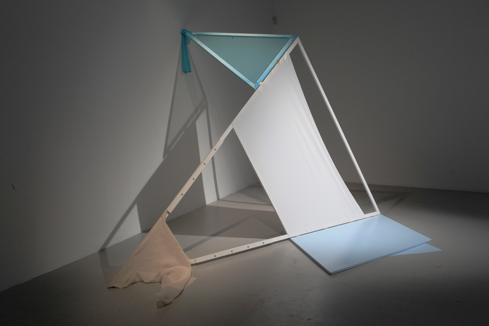 Sandy de Lissovoy and David Kelley produced Survival Based Camp, a 20-minute single-channel video, filmed at various sites in Brooklyn and Northeast Los Angeles. Through their multiyear, bi-coastal collaboration, Los Angeles-based artist de Lissovoy and New York-based artist Kelley built a series of sculptures from lightweight wood, hinged and stretched with fabric. The sculptures function in the video as props and architecture, alluding to the temporary and theatrical quality of stage sets or unfinished buildings. Performers interact with these objects, forming sequences of choreographed movements and improvisations, in which the performers discover their physical relationships to the sculptures and to the in-between spaces of the urban and industrial sites that they occupy.